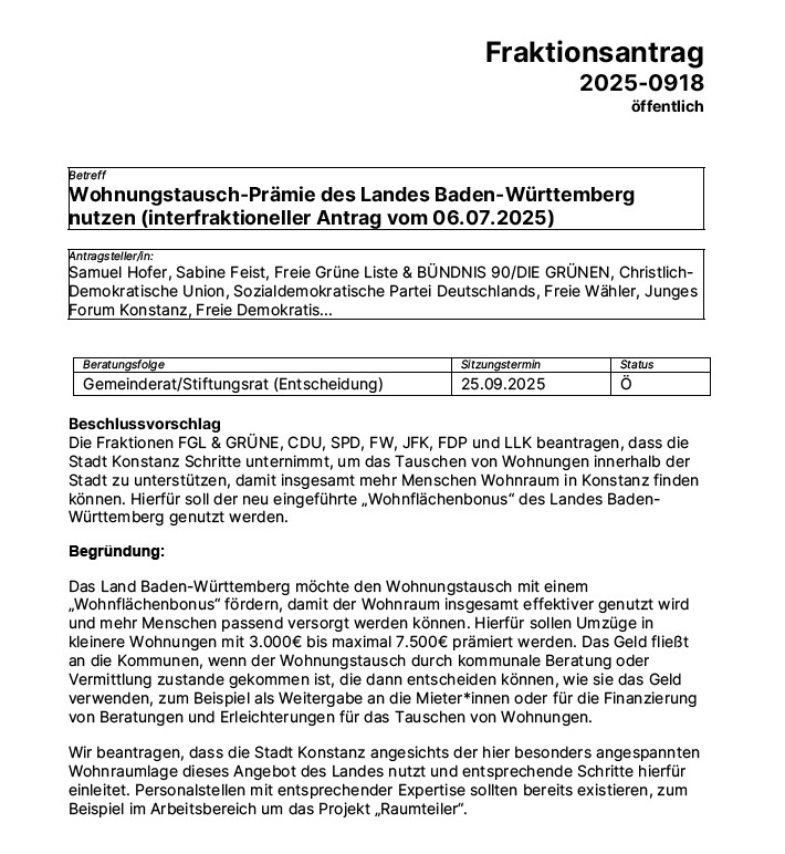 Auf unsere Initiative hin gab es einen überfraktionellen Antrag zur finanziellen Förderung für das Tauschen von Wohnungen in Konstanz. Dieser Antrag wurde jetzt einstimmig im TUA vorberaten und wird nächste Woche im Gemeinderat besprochen. Die Verwaltung wird dann nach positivem Beschluss des Gemeinderats den neuen „Wohnflächenbonus“ des Landes für Konstanz einführen.